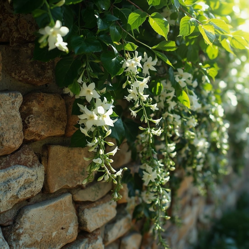Toscaanse Jasmijn: Als klimplant tegen de gevel zorgt dit voor een blijvend groen 'behang' dat je vanuit je luie stoel ziet.